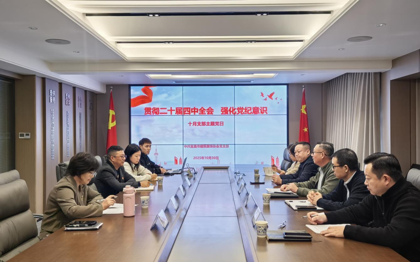 为深入学习贯彻党的二十届四中全会精神,切实统一党员思想和行动,10月29日,宜昌市建筑装饰协会党支部以“贯彻二十届四中全会精神,强化党纪意识”为主题开展十月主题党日活动。会议由宜昌市装饰协会党支部书记彭康主持,全体党员、预备党员及积极分子参加。