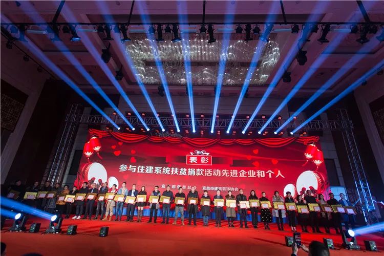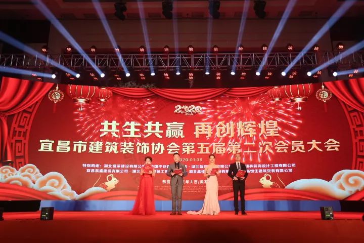 下午4时,以“共生共赢·再创辉煌”为主题的宜昌市建筑装饰协会2020年迎春年会,在热情、欢快的开场歌舞中隆重启幕。市建筑装饰协会会长彭康致欢迎词;袁庆华总工和成诗秘书长分别代表宜昌市住建局和湖北省建筑装饰协会致辞。年会期间,市建筑装饰协会对获得“2018年度宜昌市优质建筑装饰工程”、“2019年湖北省优良建筑装饰工程”、“2019-2020年度中国建筑工程装饰奖”的承建企业分别颁发了奖杯、奖牌和证书;市慈善总会和市建筑装饰协会对2019年度积极参与精准扶贫的先进企业和个人进行表彰,颁发了奖牌和证书。随后,由13家会员企业选送文艺节目进行了精彩表演。最后,宜昌市建筑装饰协会第五届常务理事会领导集体上台演唱《我和我的祖国》,年会活动在高亢激越和饱含深情的歌声中结束。