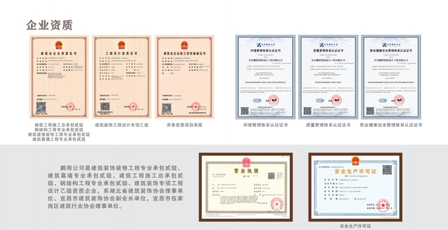 宜昌鹏程装饰设计工程有限公司具备建筑装饰工程专项设计乙级、建筑工程施工总承包贰级、钢结构工程专业承包贰级、建筑装修装饰工程专业承包贰级、建筑幕墙工程专业承包贰级,通过ISO三体系认证(质量、环境、职业健康安全)。