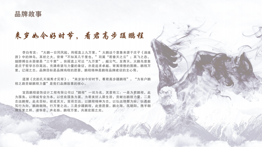宜昌鹏程装饰设计工程有限公司位于长江之滨的宜昌市。以“设计重塑空间,匠心成就未来”为核心理念,专注商业、办公、酒店及人居空间的创新设计与工程施工。以展厅展馆和文化建设为特色业务板块,树立区域领先地位。公司凭借前瞻性的设计思维、严谨的施工管理及卓越的客户服务,成为鄂西地区装饰设计领域的标杆企业,并持续以卓越作品赋能城市美学与功能升级。