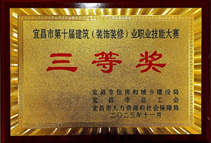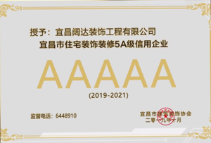 3、获得荣誉:公司先后被评为《宜昌市十大优秀大宅设计机构》、《宜昌市住宅装饰装修5A级信用企业》、2022年至2025年,连续四年荣登全市装修及建材企业经营行为红榜,2021年被宜荆荆恩住博会组委会授予《诚信装饰装修企业》,2022年至2024年连续三年被宜昌市建筑装饰协会、宜昌市住建委评为“宜昌市十强家装企业” 和“宜昌十强建筑装饰企业”,在宜昌市第十届建筑(装饰装修)职业技能大赛中,荣膺三等奖;2024年被湖北省评为“标杆企业”;公司还连续多年被评为“精准扶贫优秀企业”;在2020年新冠疫情肆虐期间,更是被评为“抗疫先进企业”。