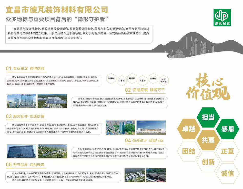 在建筑与装饰行业,粘胶辅材虽是小材料,却承载着安全、美观与耐久的重大责任。成立于2014年的宜昌市德芃装饰材料有限公司,十一年来始终专注于粘胶辅材领域,致力于为客户提供一站式高品质粘胶辅材解决方案,成为宜昌乃至鄂西地区众多地标建筑与重要项目的“隐形守护者”。