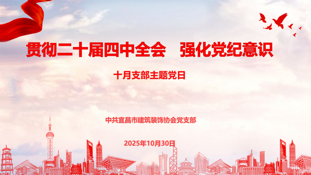 为深入学习贯彻党的二十届四中全会精神,切实统一党员思想和行动,10月29日,宜昌市建筑装饰协会党支部以“贯彻二十届四中全会精神,强化党纪意识”为主题开展十月主题党日活动。会议由宜昌市装饰协会党支部书记彭康主持,全体党员、预备党员及积极分子参加。